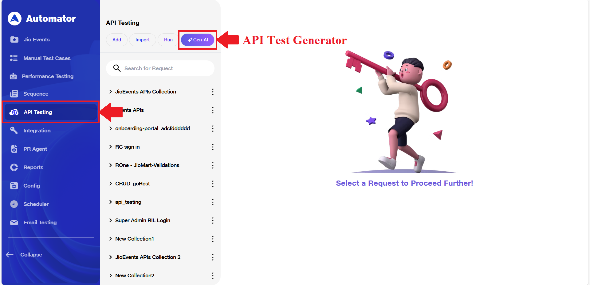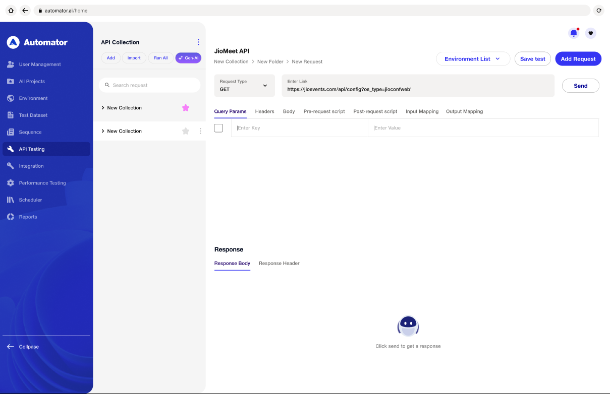 a) Navigate to the API Testing page where you will also find the Generate APIs with AI icon located next to the Import Collection button.