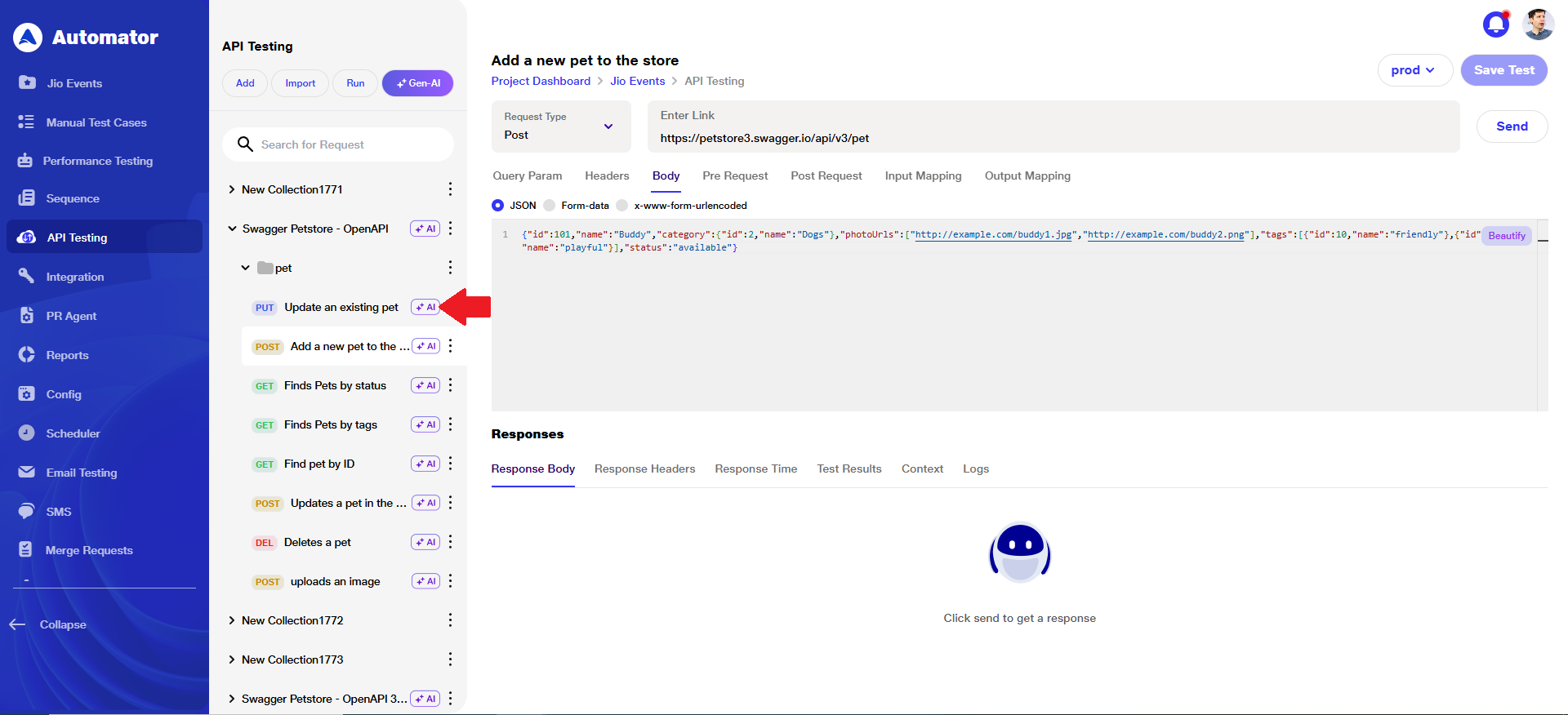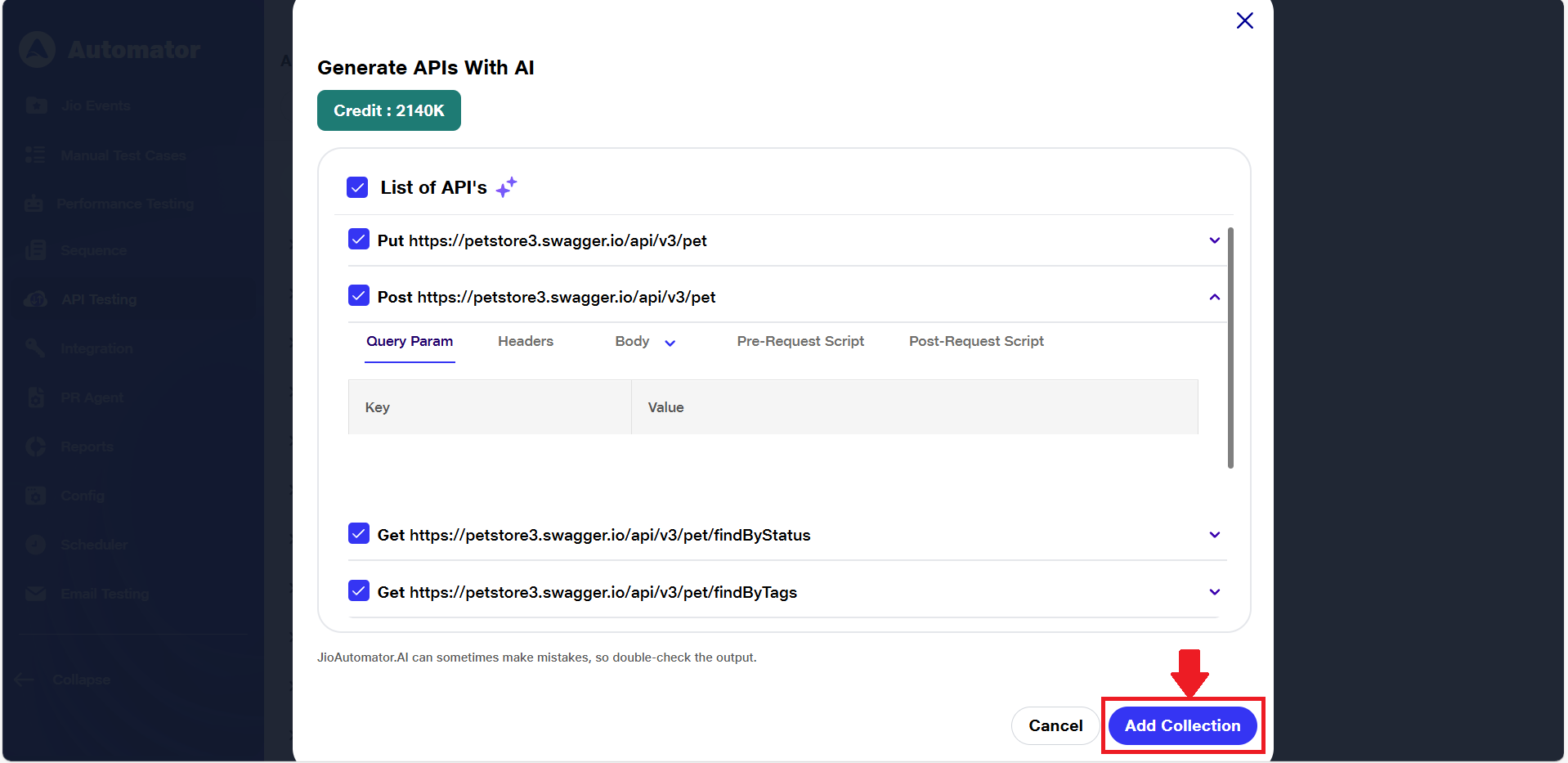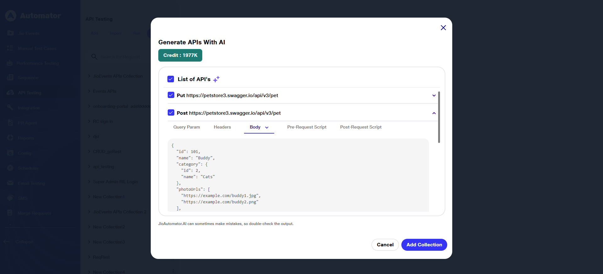 e) After transferring the AI-generated APIs into the collection, verify that the request details (URL, request body, post-request data, etc.) are prefilled based on the provided schema.