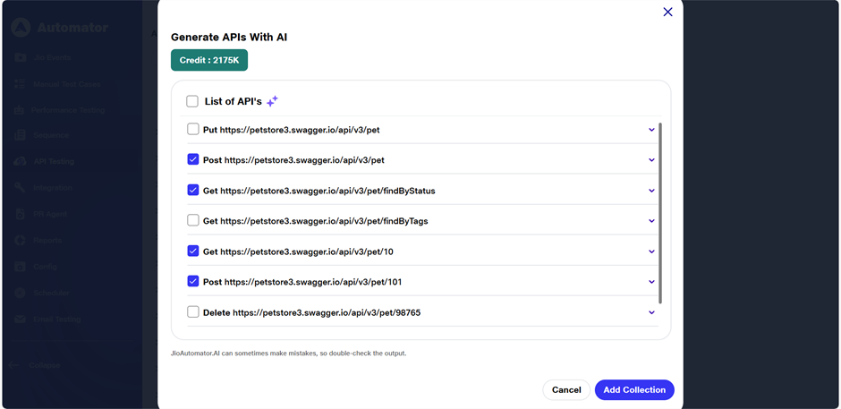 h) As per user’s needs, user can deselect any API that he/ she doesn’t want to include by unchecking the corresponding checkboxes next to each API entry. This gives users flexibility to generate tests only for the endpoints you care about.