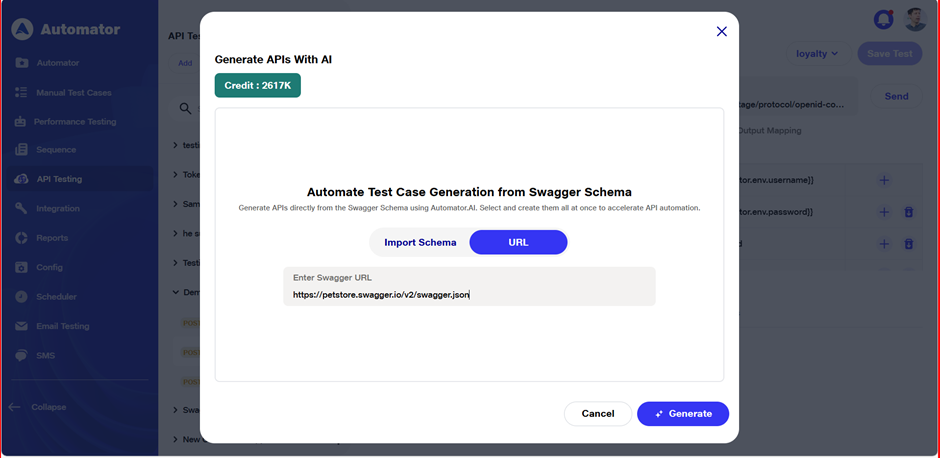 AI-driven API Test Generation enables automatic creation of test cases from Swagger schema definitions using artificial intelligence. This allows users to instantly generate structured, intelligent test scenarios without manually writing test scripts. It streamlines the testing process, improves coverage, and ensures faster validation of API functionality.