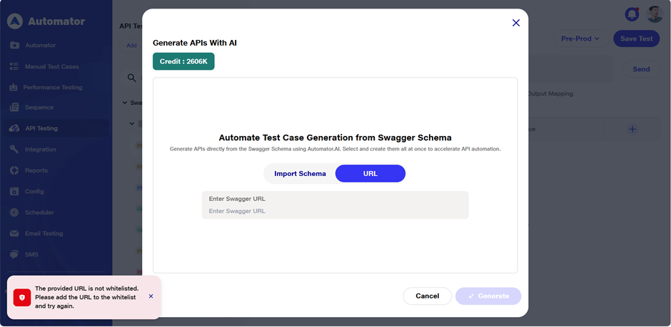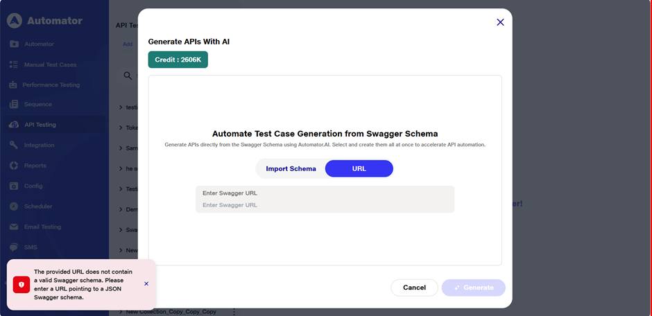 i) URL Validation Restriction: If the entered URL does not contain a valid Swagger schema, the following error toast will be displayed: The provided URL does not contain a valid Swagger schema. Please enter a URL pointing to a JSON Swagger schema.