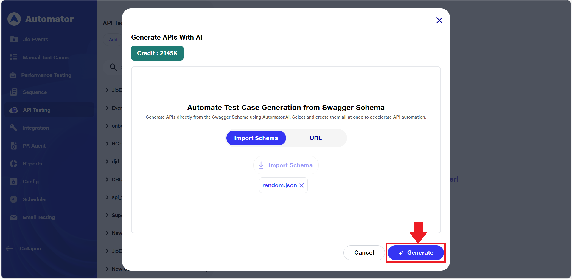 a) After successfully importing the Swagger schema, once the AI receives the schema then the Generate button will be enabled. Click on it to proceed.
