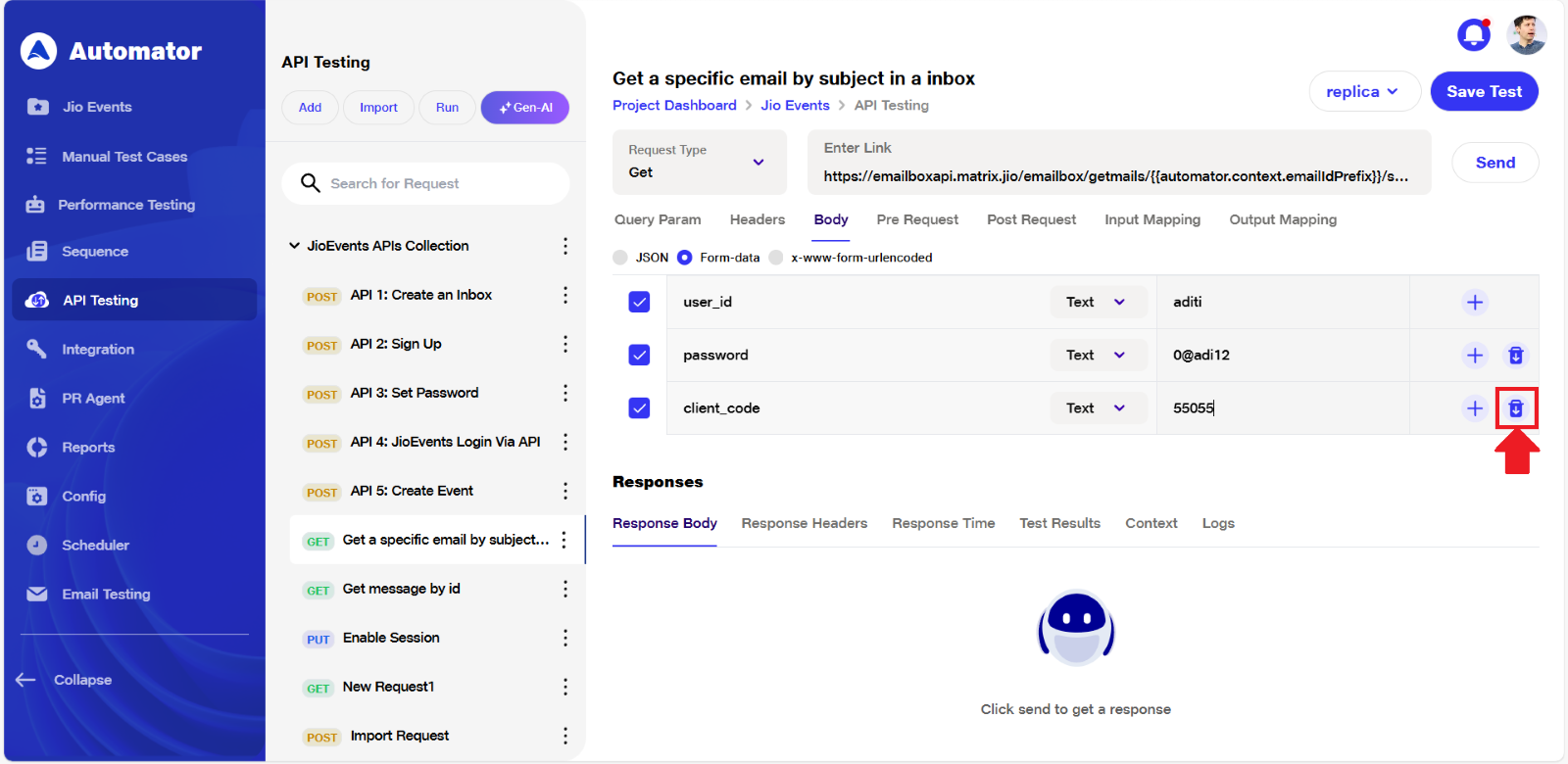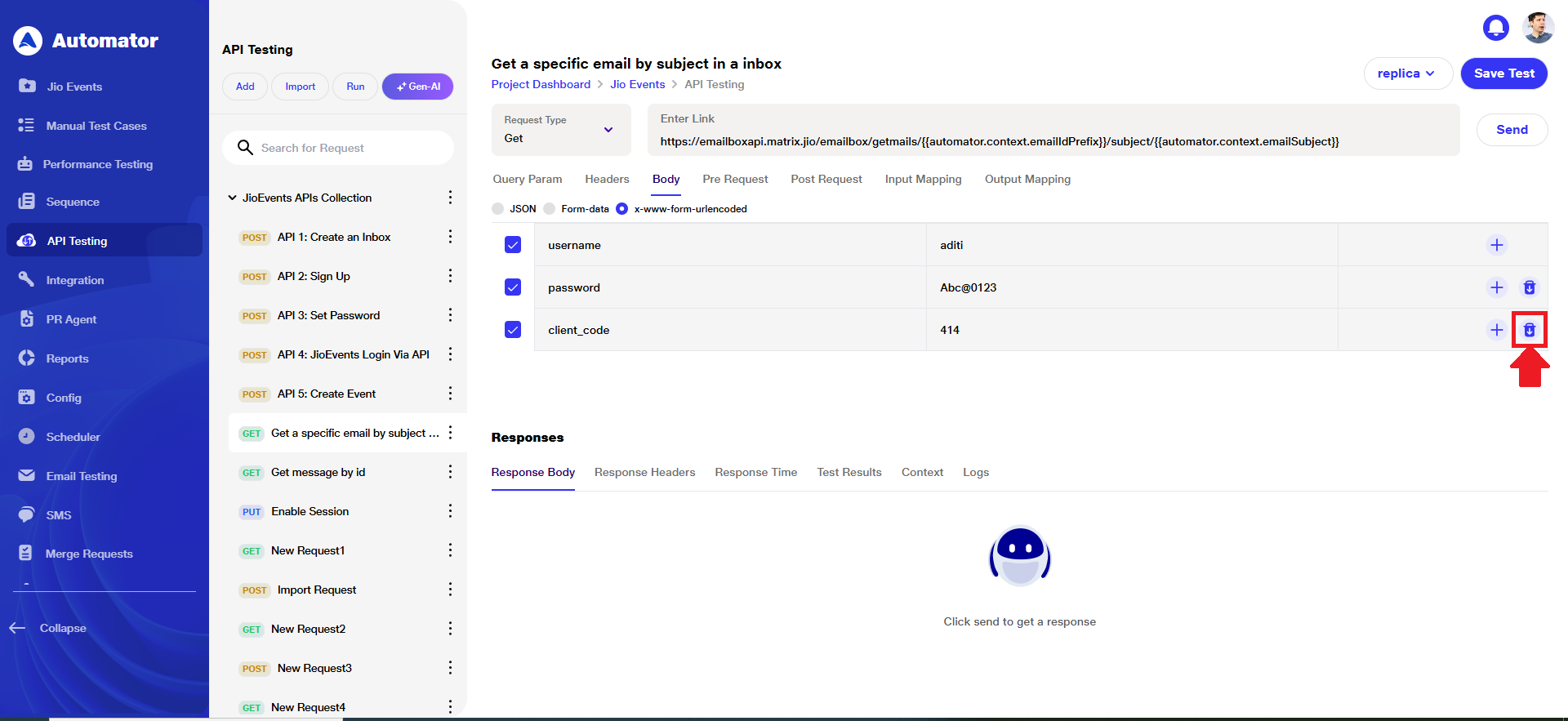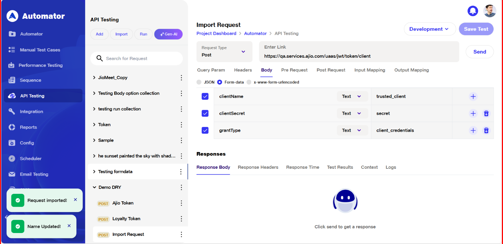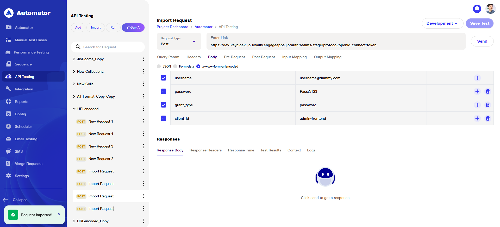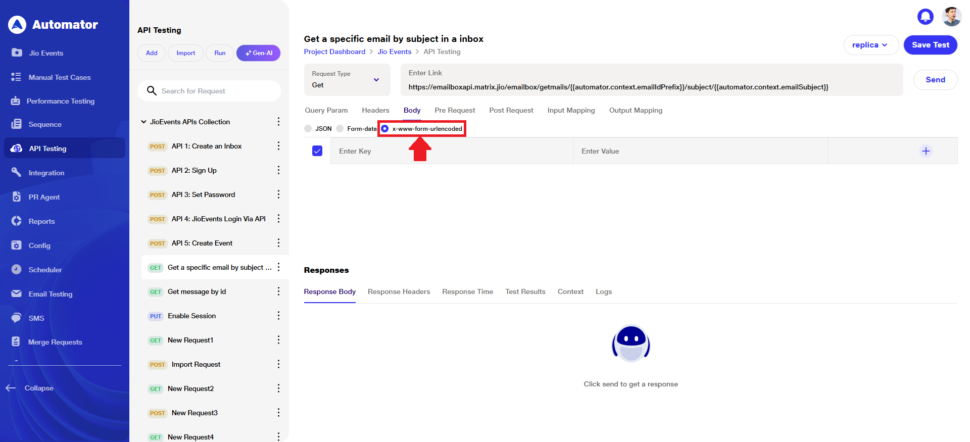 Here, we have the ability to test the API in various environments by choosing different environment variables from the environment list. We can get the base of url of the API as {{automator.env.url}}.