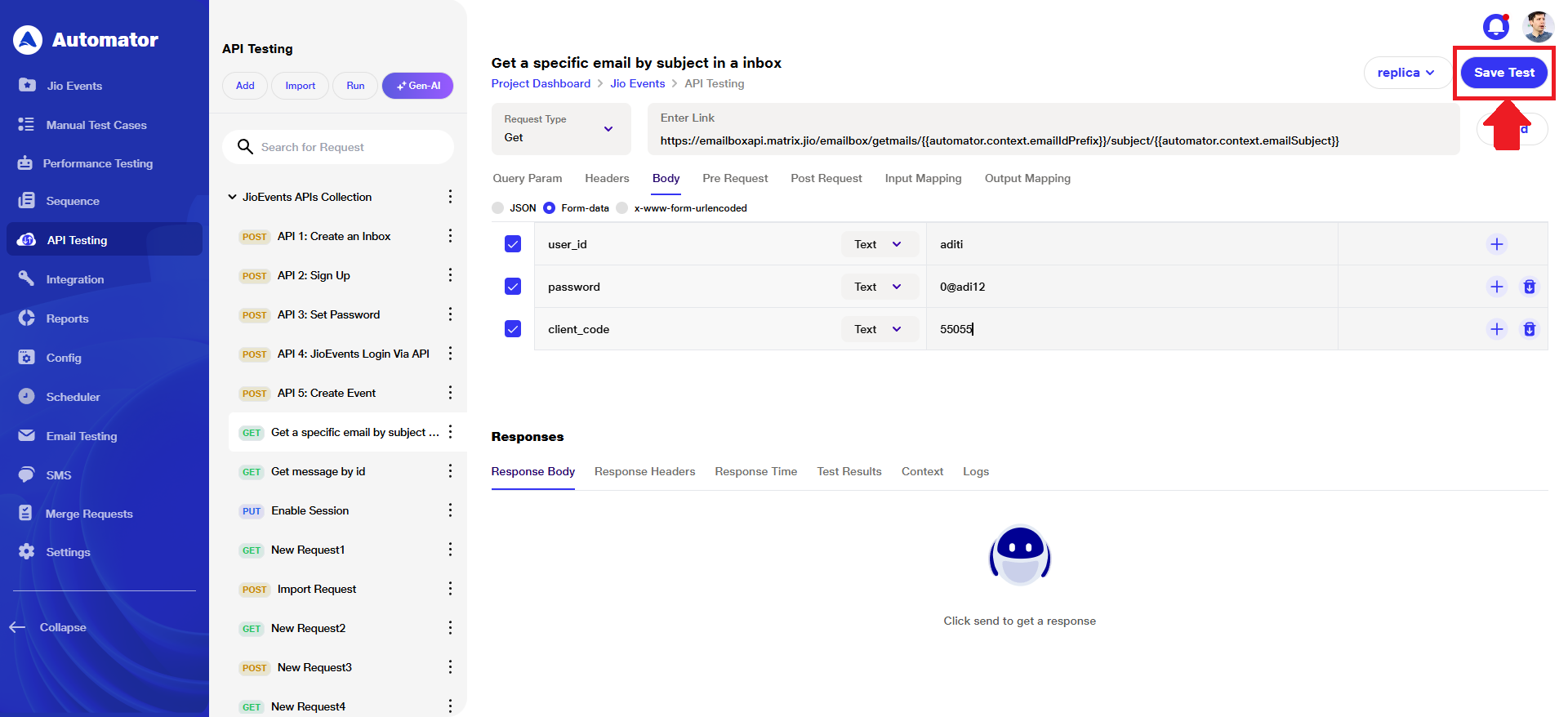 a)After entering your key-value pairs, click Save Test to save your form-data configuration.