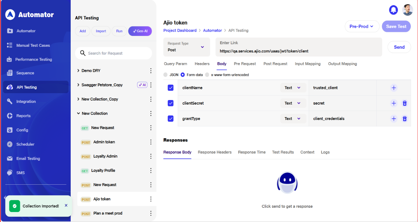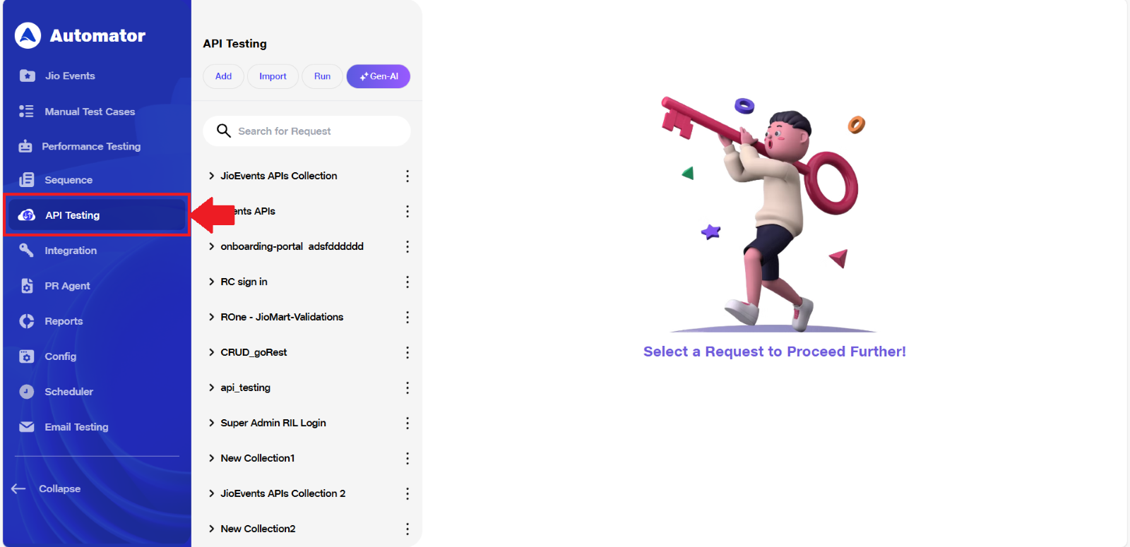 Let's kick off the API testing process using the Automator. Begin by creating a project and navigate to the API Testing module.