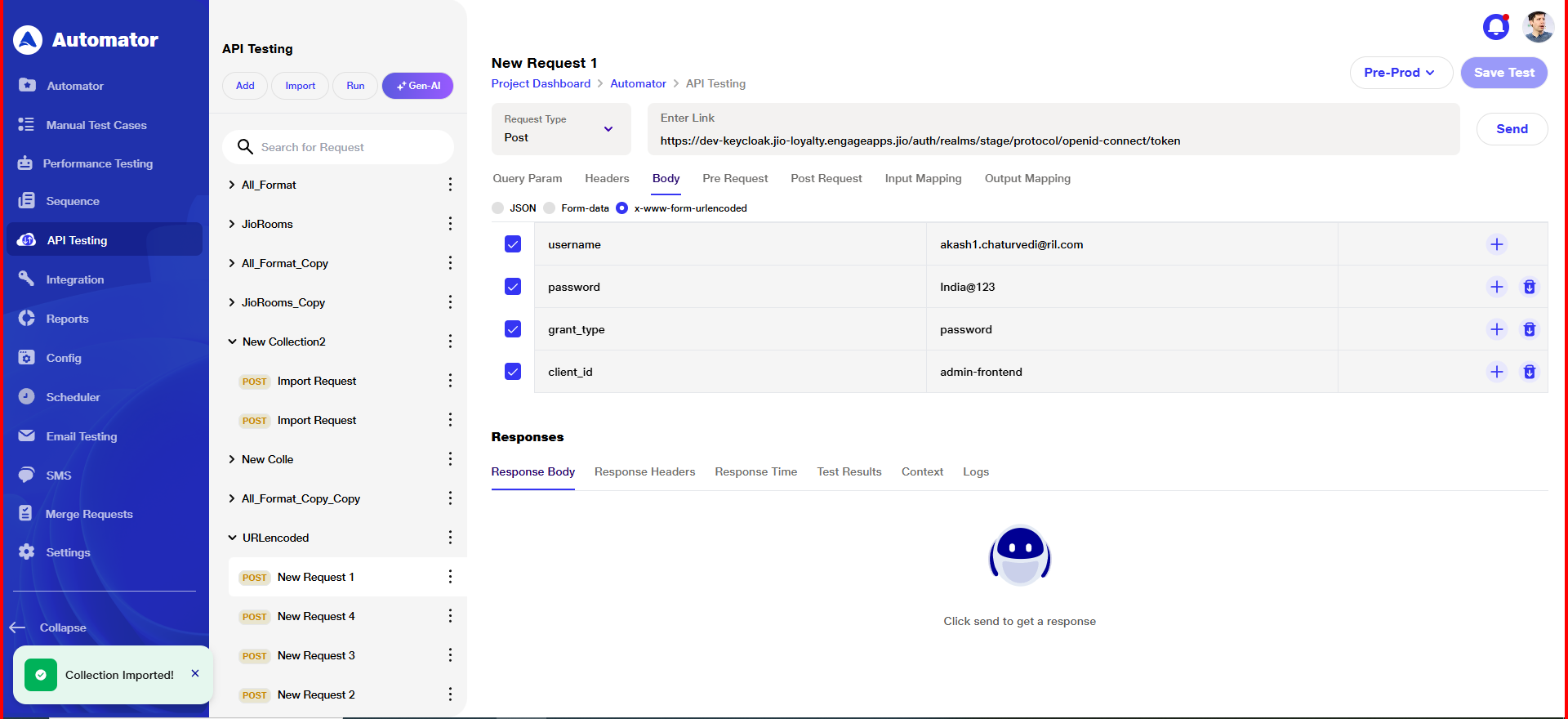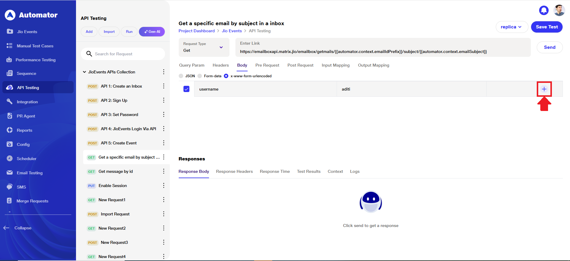 Here, we have the ability to test the API in various environments by choosing different environment variables from the environment list. We can get the base of url of the API as {{automator.env.url}}.