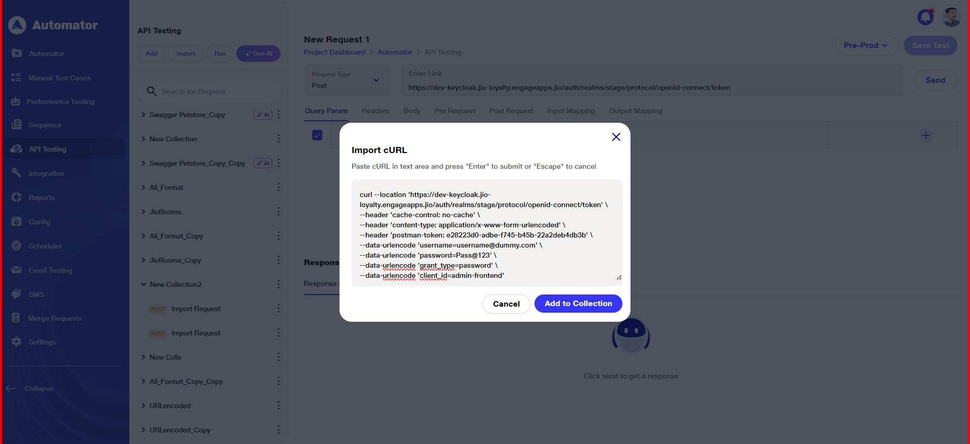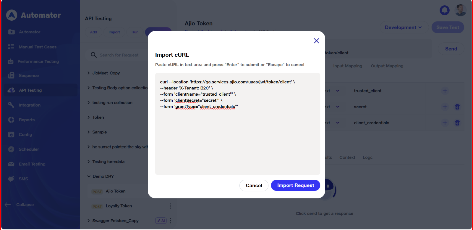 b) The same applies when importing a cURL command with form-data — all key-value pairs are shown and editable. This ensures accuracy and saves time by avoiding manual re-entry.