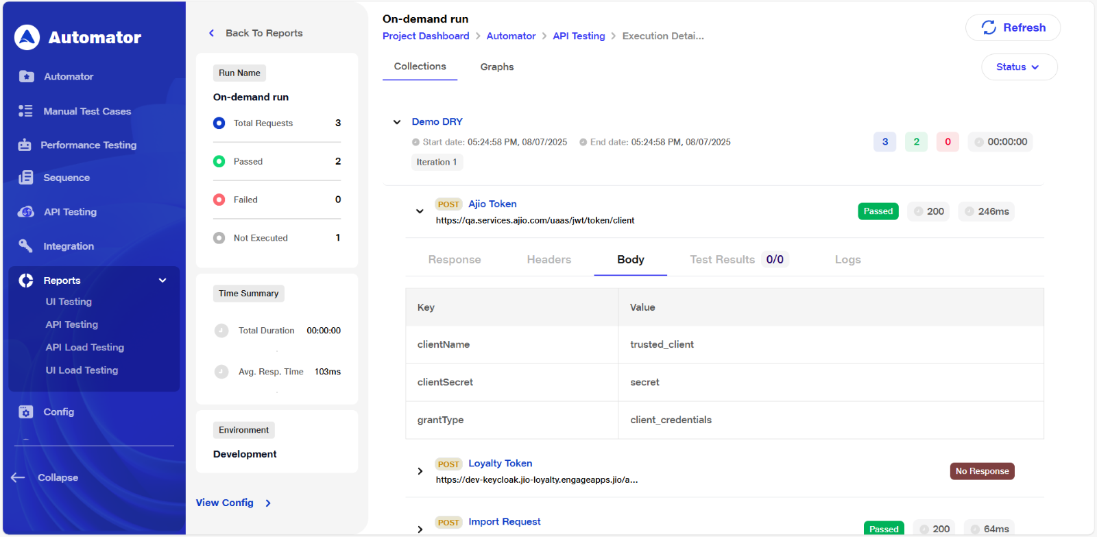 Report Generation: After execution completes, reports capture and display results in the Test Results tab, including the received response body.