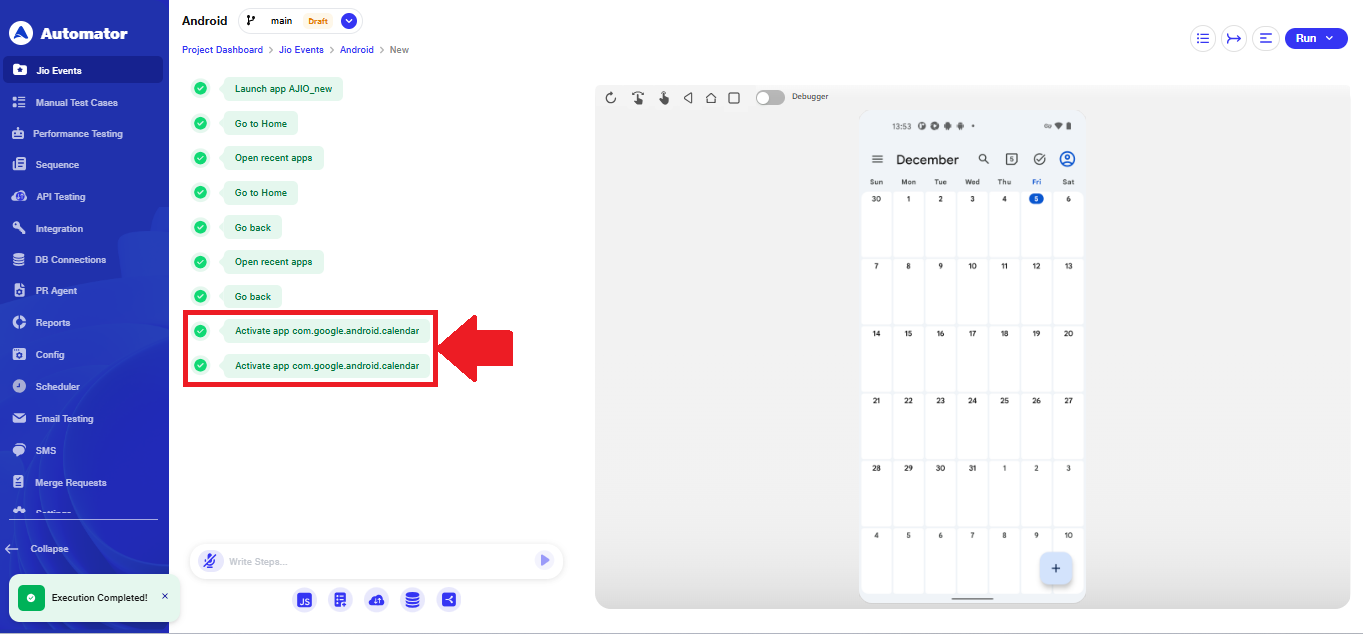 a)Once a suite is created, users can then create scenarios within it. By default, the first step of any scenario will be the Launch App command, which takes the format of Launch app [APK Name] (e.g., Launch app MyJio).
