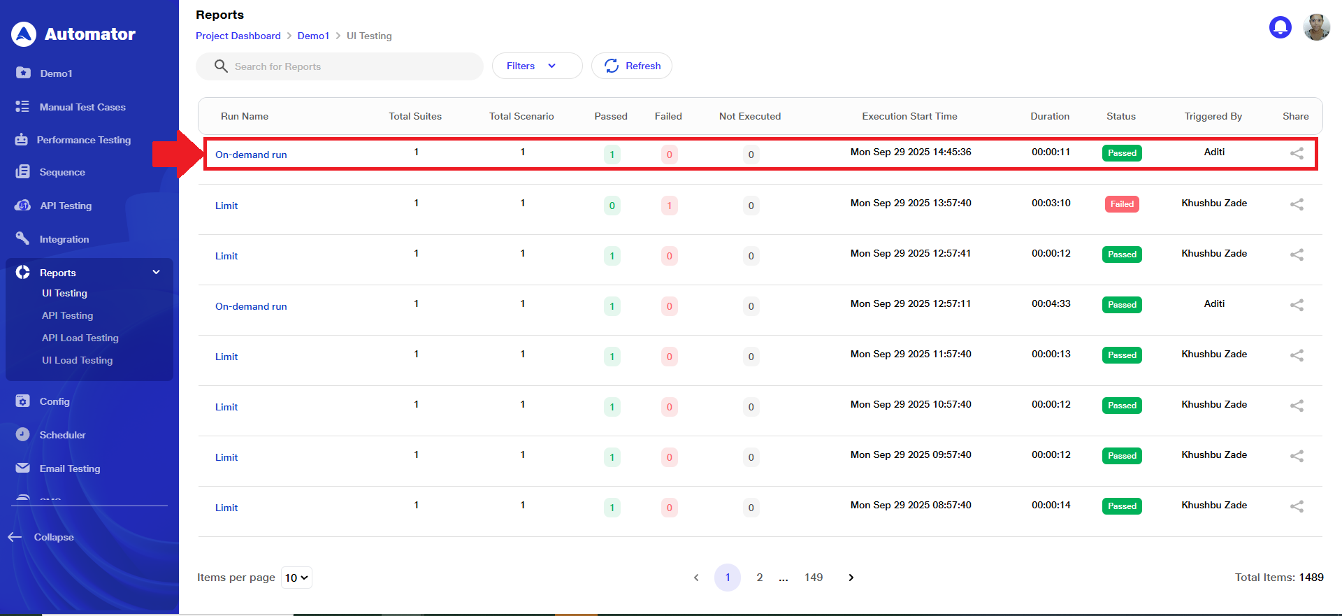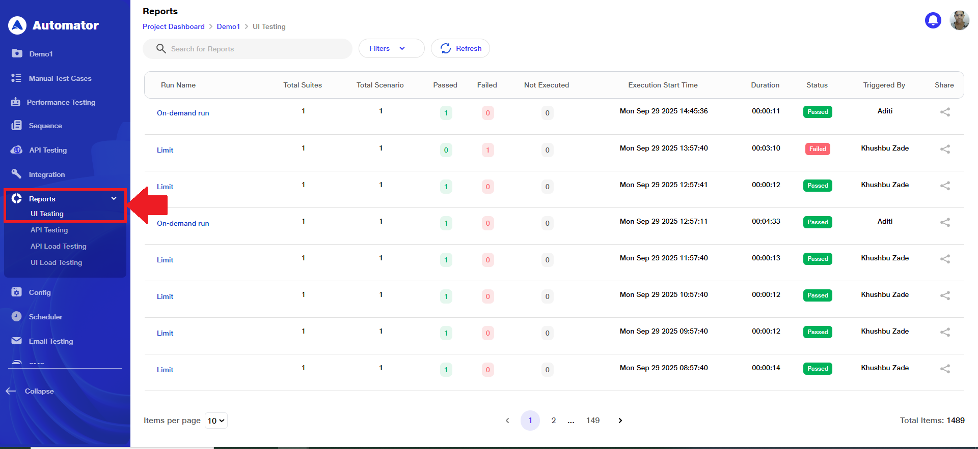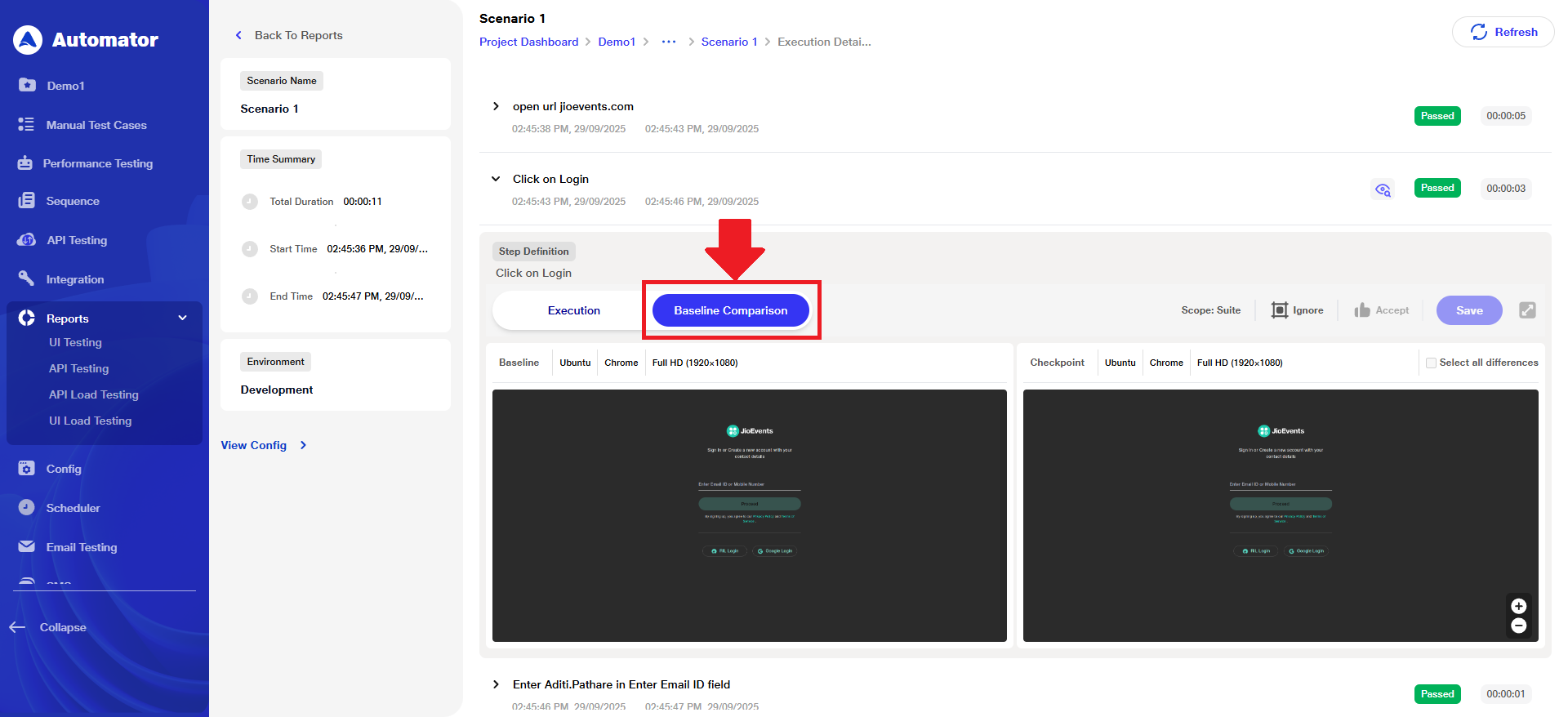 ii)Users can view detailed comparisons in the reports section under Reports > UI Testing > Compare baseline.