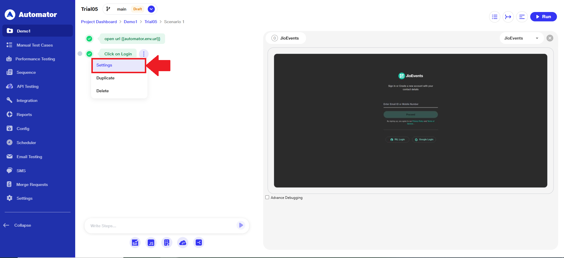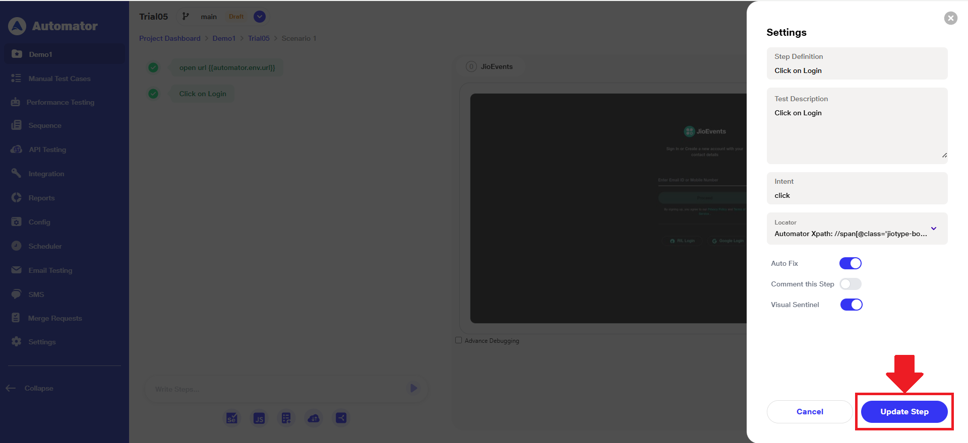d) Once baseline images have been generated for test steps, any modification to the Step Definition, Input Value, or Locator—combined with Visual Validation being enabled—will trigger an automatic update of the baseline image upon test execution. After the test runs: