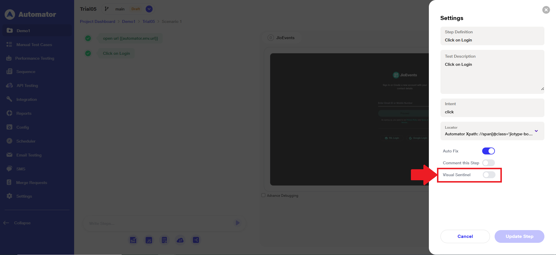 d) In the Settings panel, you'll find a 'Visual Sentinel' toggle. You can enable or disable this option to control whether visual validation is applied to this specific step.