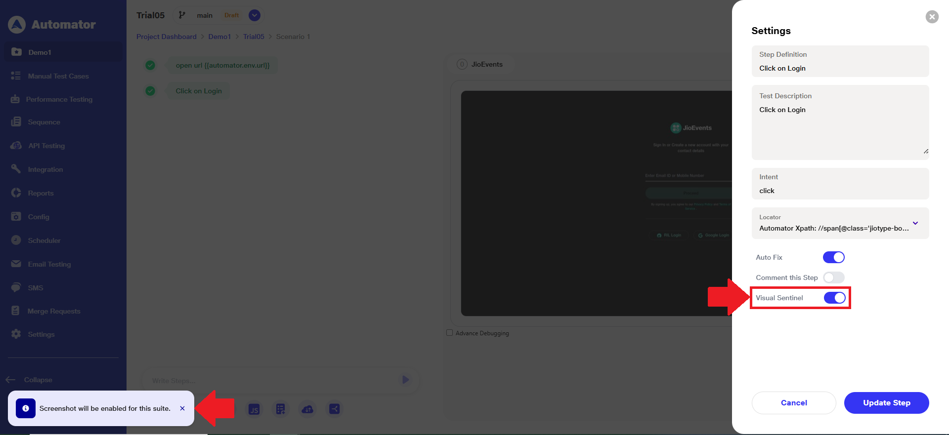 a) At each step within the scenario, a 'Visual Sentinel' toggle is available inside the step's settings panel.
