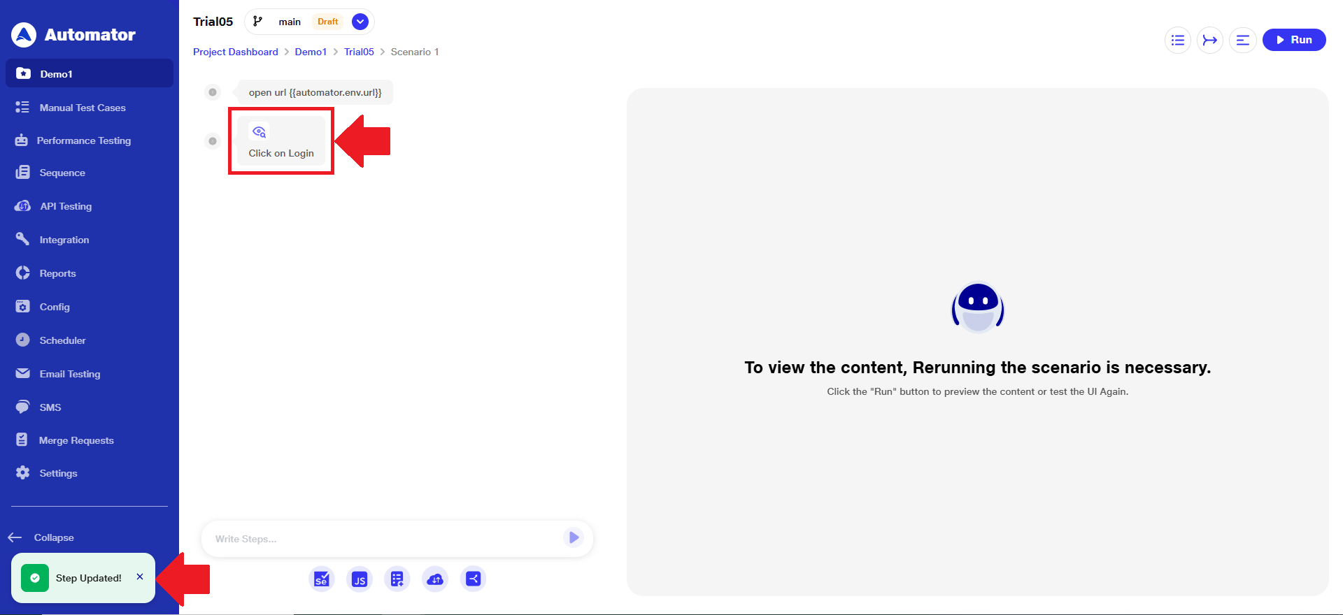 k) A 'Step Updated!' popup will appear confirming the changes.